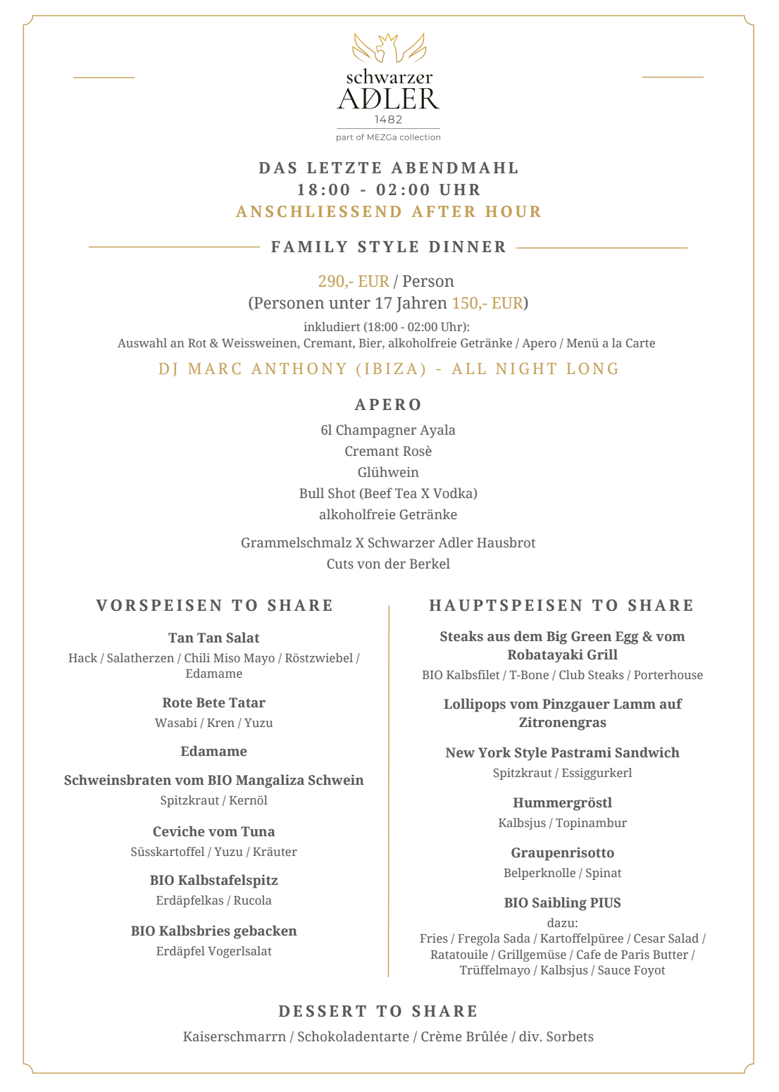 (Personen unter 17 Jahren 150,- EUR) inkludiert (18:00 - 02:00 Uhr):